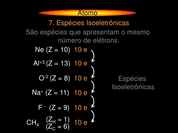 33. 33. Átomo 7. Espécies IsoeletrônicasSão espécies que apresentam o mesmo número de elétrons. Ne (Z = 10) 10 e Al+3 (Z = 13) 10 e O-2 (Z = 8) 10 e Espécies Isoeletrônicas Na+ (Z = 11) 10 e F - (Z = 9) 10 eCH4 (ZH = 1) 10 e (ZC = 6)