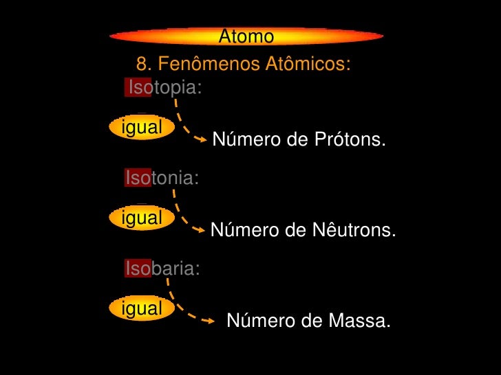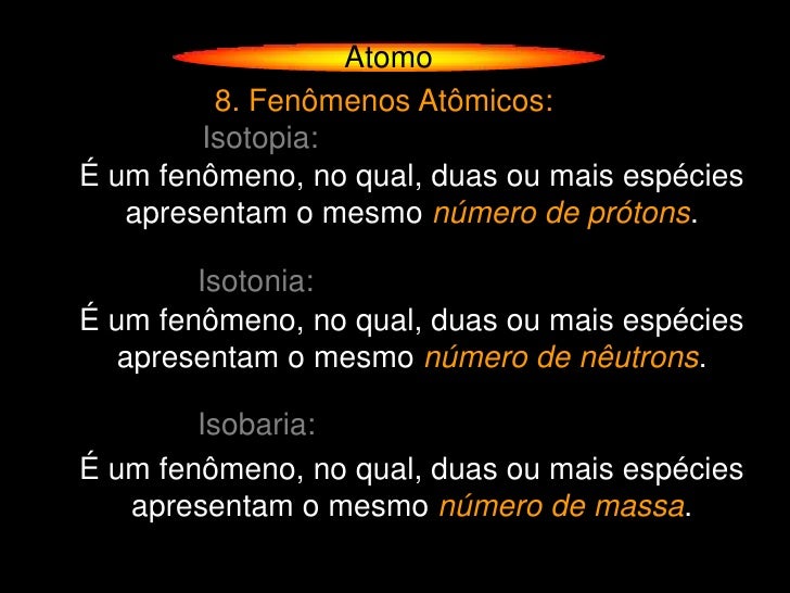35. 35. Átomo 8. Fenômenos Atômicos:Isotopia:igual Número de Prótons.Isotonia:igual Número de Nêutrons.Isobaria:igual Número de Massa.