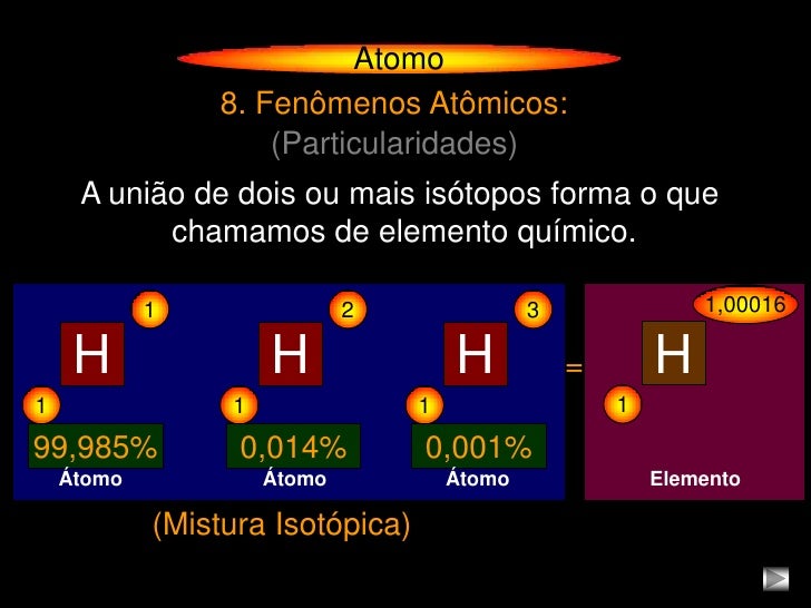 41. 41. Átomo 8. Fenômenos Atômicos: (Particularidades) A união de dois ou mais isótopos forma o que chamamos de elemento químico. 1 2 3 1,00016 H H H = H1 1 1 199,985% 0,014% 0,001% Átomo Átomo Átomo Elemento (Mistura Isotópica)