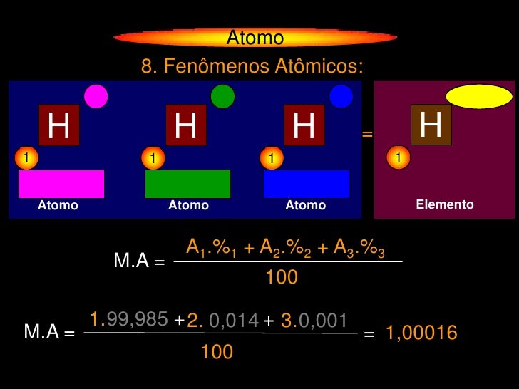 42. 42. Átomo 8. Fenômenos Atômicos: 1 2 3 1,00016 H H H = H1 1 1 199,985% 0,014% 0,001% Átomo Átomo Átomo Elemento A1.%1 + A2.%2 + A3.%3 M.A = 100 1.99,985 + 2. 0,014 + 3.0,001M.A = = 1,00016 100