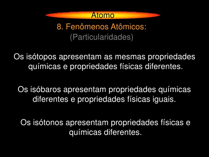 43. 43. Átomo 8. Fenômenos Atômicos: (Particularidades)Os isótopos apresentam as mesmas propriedades químicas e propriedades físicas diferentes. Os isóbaros apresentam propriedades químicas diferentes e propriedades físicas iguais. Os isótonos apresentam propriedades físicas e químicas diferentes.