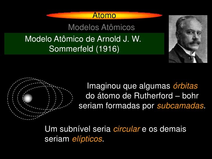 6. 6. Átomo Modelos AtômicosModelo Atômico de Arnold J. W. Sommerfeld (1916) Imaginou que algumas órbitas do átomo de Rutherford – bohr seriam formadas por subcamadas. Um subnível seria circular e os demais seriam elípticos.