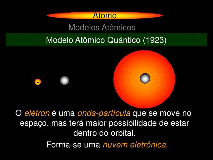 8. 8. Átomo Modelos Atômicos Modelo Atômico Quântico (1923) -O elétron é uma onda-partícula que se move no espaço, mas terá maior possibilidade de estar dentro do orbital. Forma-se uma nuvem eletrônica.