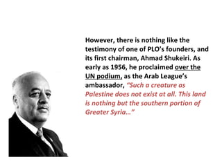 11. 11. However, there is nothing like the testimony of one of PLO’s founders, and its first chairman, Ahmad Shukeiri. As early as 1956, he proclaimed over the UN podium, as the Arab League’s ambassador, “Such a creature as Palestine does not exist at all. This land is nothing but the southern portion of Greater Syria …”