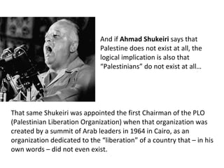 12. 12. And if Ahmad Shukeiri says that Palestine does not exist at all, the logical implication is also that “Palestinians” do not exist at all… That same Shukeiri was appointed the first Chairman of the PLO (Palestinian Liberation Organization) when that organization was created by a summit of Arab leaders in 1964 in Cairo, as an organization dedicated to the “liberation” of a country that – in his own words – did not even exist.