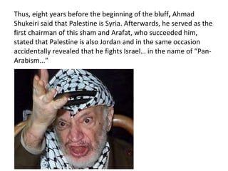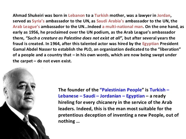 13. 13. Thus, eight years before the beginning of the bluff , Ahmad Shukeiri said that Palestine is Syria. Afterwards, he served as the first chairman of this sham and Arafat, who succeeded him, stated that Palestine is also Jordan and in the same occasion accidentally revealed that he fights Israel… in the name of “Pan-Arabism...”