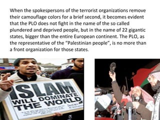 14. 14. When the spokespersons of the terrorist organizations remove their camouflage colors for a brief second, it becomes evident that the PLO does not fight in the name of the so called plundered and deprived people, but in the name of 22 gigantic states, bigger than the entire European continent. The PLO, as the representative of the “Palestinian people”, is no more than a front organization for those states .