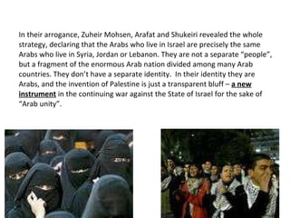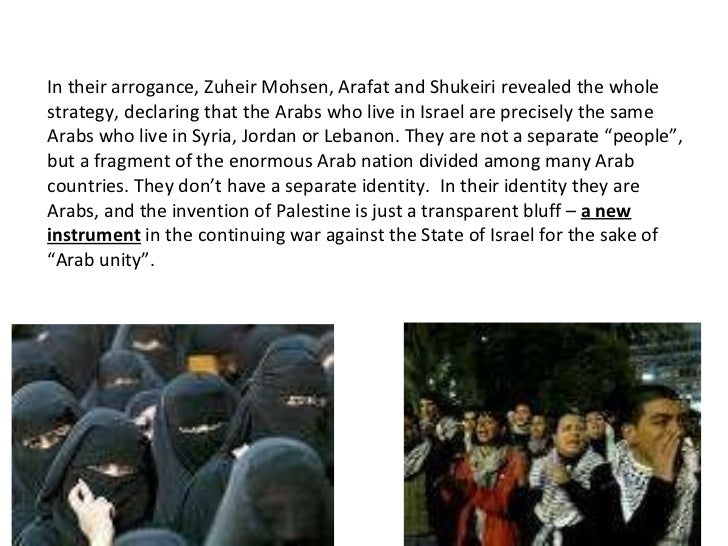 15. 15. In their arrogance, Zuheir Mohsen, Arafat and Shukeiri revealed the whole strategy, declaring that the Arabs who live in Israel are precisely the same Arabs who live in Syria, Jordan or Lebanon. They are not a separate “people”, but a fragment of the enormous Arab nation divided among many Arab countries. They don’t have a separate identity. In their identity they are Arabs, and the invention of Palestine is just a transparent bluff – a new instrument in the continuing war against the State of Israel for the sake of “Arab unity”.