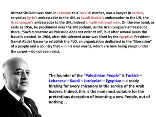 16. 16. Ahmad Shukeiri was born in Lebanon to a Turkish mother, was a lawyer in Jordan , served as Syria’s ambassador to the UN, as Saudi Arabia’s ambassador to the UN, the Arab League’s ambassador to the UN…Indeed a multi-national man . On the one hand, as early as 1956, he proclaimed over the UN podium, as the Arab League’s ambassador there, “Such a creature as Palestine does not exist at all”, but after several years the fraud is created. In 1964, after this talented actor was hired by the Egyptian President Gamal Abdel Nasser to establish the PLO, an organization dedicated to the “liberation” of a people and a country that – in his own words, which are now being swept under the carpet – do not even exist. The founder of the “Palestinian People ” is Turkish – Lebanese – Saudi – Jordanian – Egyptian – a ready hireling for every chicanery in the service of the Arab leaders. Indeed, this is the man most suitable for the pretentious deception of inventing a new People, out of nothing …