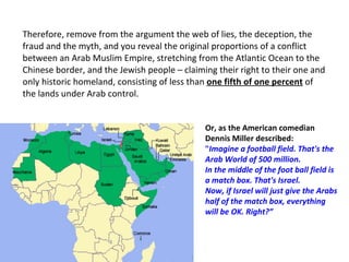 17. 17. Therefore, remove from the argument the web of lies, the deception, the fraud and the myth, and you reveal the original proportions of a conflict between an Arab Muslim Empire, stretching from the Atlantic Ocean to the Chinese border, and the Jewish people – claiming their right to their one and only historic homeland, consisting of less than one fifth of one percent of the lands under Arab control. Or, as the American comedian Dennis Miller described: &quot; Imagine a football field. That's the Arab World of 500 million. In the middle of the foot ball field is a match box. That's Israel. Now, if Israel will just give the Arabs half of the match box, everything will be OK. Right?”
