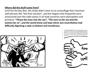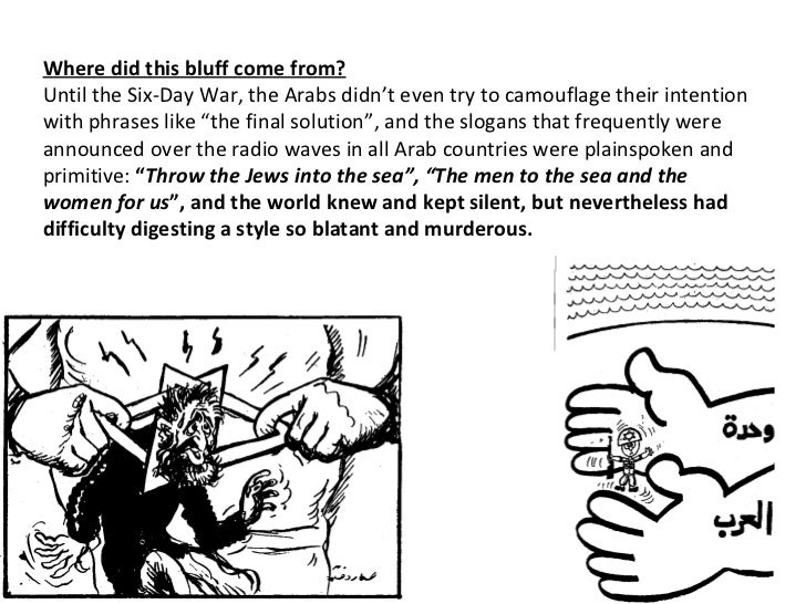 18. 18. Where did this bluff come from? Until the Six-Day War, the Arabs didn’t even try to camouflage their intention with phrases like “the final solution”, and the slogans that frequently were announced over the radio waves in all Arab countries were plainspoken and primitive: “ Throw the Jews into the sea”, “The men to the sea and the women for us ”, and the world knew and kept silent, but nevertheless had difficulty digesting a style so blatant and murderous.