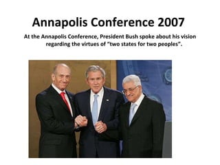 2. 2. Annapolis Conference 2007 <ul><li>At the Annapolis Conference, President Bush spoke about his vision regarding the virtues of “two states for two peoples”. </li></ul>