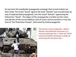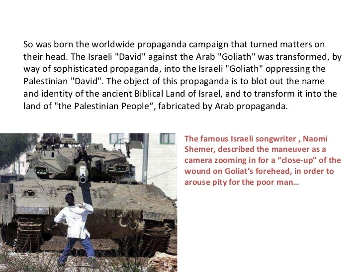 20. 20. So was born the worldwide propaganda campaign that turned matters on their head. The Israeli &quot;David&quot; against the Arab &quot;Goliath&quot; was transformed, by way of sophisticated propaganda, into the Israeli &quot;Goliath&quot; oppressing the Palestinian &quot;David&quot;. The object of this propaganda is to blot out the name and identity of the ancient Biblical Land of Israel, and to transform it into the land of &quot;the Palestinian People“, fabricated by Arab propaganda. The famous Israeli songwriter , Naomi Shemer, described the maneuver as a camera zooming in for a “close-up” of the wound on Goliat’s forehead, in order to arouse pity for the poor man…