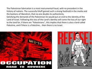 21. 21. The Palestinian fabrication is a most monumental fraud, with no precedent in the history of nations. The successful bluff gained such a strong foothold in the media and the bastions of liberalism, that no one doubts its authenticity. Satisfying the demands of the Palestinian lie would put an end to the identity of the Land of Israel. Following this loss of the Land's identity will come the loss of our right to the land for, if there are &quot;Palestinians&quot;, this implies that there is also a land called Palestine, and if there is a Palestine… then there is no Israel.