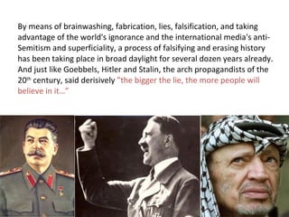 22. 22. By means of brainwashing, fabrication, lies, falsification, and taking advantage of the world's ignorance and the international media's anti-Semitism and superficiality, a process of falsifying and erasing history has been taking place in broad daylight for several dozen years already. And just like Goebbels, Hitler and Stalin, the arch propagandists of the 20 th century, said derisively ”the bigger the lie, the more people will believe in it…”