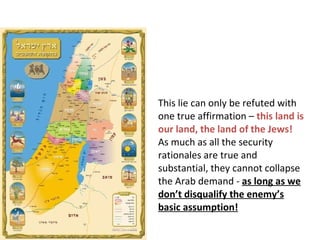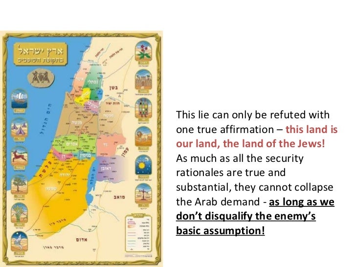 23. 23. This lie can only be refuted with one true affirmation – this land is our land, the land of the Jews! As much as all the security rationales are true and substantial, they cannot collapse the Arab demand - as long as we don’t disqualify the enemy’s basic assumption!