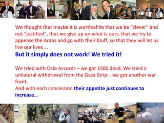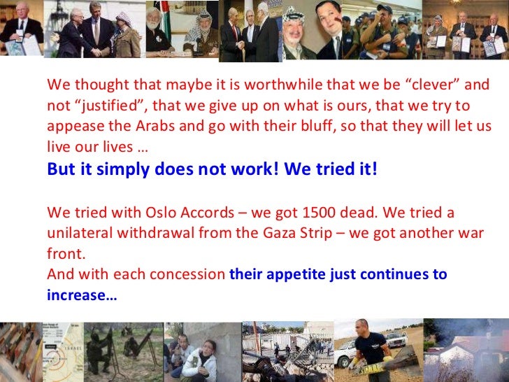 24. 24. We thought that maybe it is worthwhile that we be “clever” and not “justified”, that we give up on what is ours, that we try to appease the Arabs and go with their bluff, so that they will let us live our lives … But it simply does not work! We tried it! We tried with Oslo Accords – we got 1500 dead. We tried a unilateral withdrawal from the Gaza Strip – we got another war front. And with each concession their appetite just continues to increase…