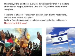 25. 25. Therefore, if the land bears a Jewish - Israeli identity then it is the land of the Jewish People, called the Land of Israel, and the Arabs are the occupiers. If the land is of Arab – Palestinian identity, then it is the Arabs’ land, and the Jews are the occupiers. And the fate of an occupier is to be removed to the last millimeter - There is no third way !