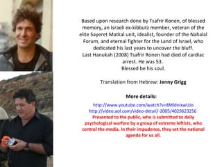 26. 26. Based upon research done by Tsafrir Ronen, of blessed memory, an Israeli ex-kibbutz member, veteran of the elite Sayeret Matkal unit, idealist, founder of the Nahalal Forum, and eternal fighter for the Land of Israel, who dedicated his last years to uncover the bluff. Last Hanukah (2008) Tsafrir Ronen had died of cardiac arrest. He was 53. Blessed be his soul. Translation from Hebrew: Jenny Grigg More details: http://www.youtube.com/watch?v=8MldnIxwUJo http://video.aol.com/video-detail/-2005/4029623256 Presented to the public, who is submitted to daily psychological warfare by a group of extreme leftists, who control the media. In their impudence, they set the national agenda for us all.