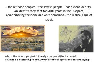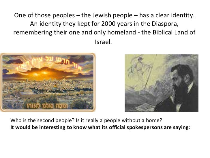 4. 4. One of those peoples – the Jewish people – has a clear identity. An identity they kept for 2000 years in the Diaspora, remembering their one and only homeland - the Biblical Land of Israel. Who is the second people? Is it really a people without a home? It would be interesting to know what its official spokespersons are saying: