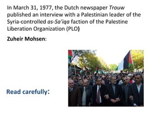 5. 5. In March 31, 1977, the Dutch newspaper Trouw published an interview with a Palestinian leader of the Syria-controlled as-Sa'iqa faction of the Palestine Liberation Organization (PLO ) Zuheir Mohsen : Read carefully :