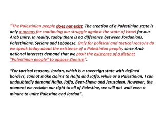 6. 6. “ The Palestinian people does not exist . The creation of a Palestinian state is only a means for continuing our struggle against the state of Israel for our Arab unity. In reality, today there is no difference between Jordanians, Palestinians, Syrians and Lebanese. Only for political and tactical reasons do we speak today about the existence of a Palestinian people , since Arab national interests demand that we posit the existence of a distinct &quot;Palestinian people&quot; to oppose Zionism ” . “For tactical reasons, Jordan, which is a sovereign state with defined borders, cannot make claims to Haifa and Jaffa, while as a Palestinian, I can undoubtedly demand Haifa, Jaffa, Beer-Sheva and Jerusalem. However, the moment we reclaim our right to all of Palestine, we will not wait even a minute to unite Palestine and Jordan” .