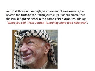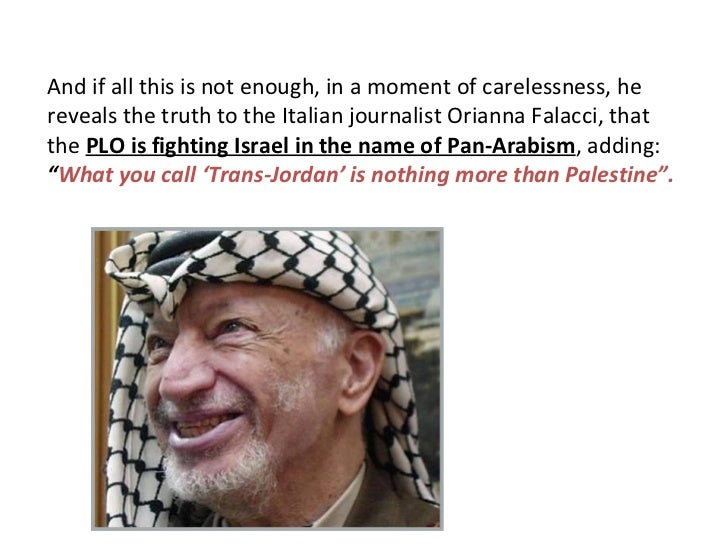 9. 9. And if all this is not enough, in a moment of carelessness, he reveals the truth to the Italian journalist Orianna Falacci, that the PLO is fighting Israel in the name of Pan-Arabism , adding: “ What you call ‘Trans-Jordan’ is nothing more than Palestine”.