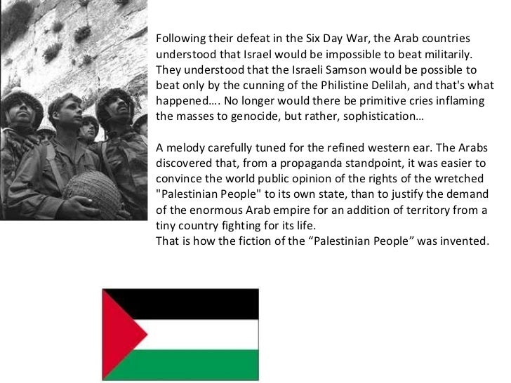 19. 19. Following their defeat in the Six Day War, the Arab countries understood that Israel would be impossible to beat militarily. They understood that the Israeli Samson would be possible to beat only by the cunning of the Philistine Delilah, and that's what happened…. No longer would there be primitive cries inflaming the masses to genocide, but rather, sophistication… A melody carefully tuned for the refined western ear. The Arabs discovered that, from a propaganda standpoint, it was easier to convince the world public opinion of the rights of the wretched &quot;Palestinian People&quot; to its own state, than to justify the demand of the enormous Arab empire for an addition of territory from a tiny country fighting for its life. That is how the fiction of the “Palestinian People” was invented.