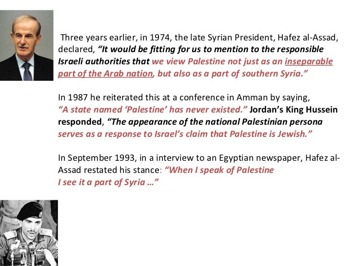 7. 7. Three years earlier, in 1974, the late Syrian President, Hafez al-Assad, declared, “It would be fitting for us to mention to the responsible Israeli authorities that we view Palestine not just as an inseparable part of the Arab nation , but also as a part of southern Syria.” In 1987 he reiterated this at a conference in Amman by saying, “A state named ‘Palestine’ has never existed.” Jordan’s King Hussein responded , “The appearance of the national Palestinian persona serves as a response to Israel’s claim that Palestine is Jewish.” In September 1993, in a interview to an Egyptian newspaper, Hafez al-Assad restated his stance : “When I speak of Palestine I see it a part of Syria …”
