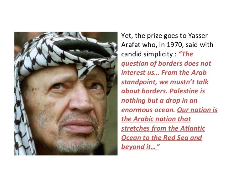 8. 8. Yet, the prize goes to Yasser Arafat who, in 1970, said with candid simplicity : “The question of borders does not interest us… From the Arab standpoint, we mustn’t talk about borders. Palestine is nothing but a drop in an enormous ocean. Our nation is the Arabic nation that stretches from the Atlantic Ocean to the Red Sea and beyond it…”
