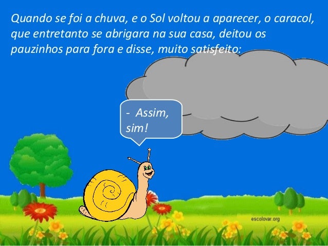 13. 13. Quando se foi a chuva, e o Sol voltou a aparecer, o caracol, que entretanto se abrigara na sua casa, deitou os pauzinhos para fora e disse, muito satisfeito: - Assim, sim!