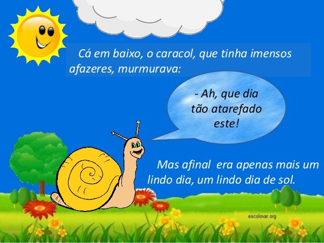 4. 4. Cá em baixo, o caracol, que tinha imensos afazeres, murmurava: - Ah, que dia tão atarefado este! Mas afinal era apenas mais um lindo dia, um lindo dia de sol.
