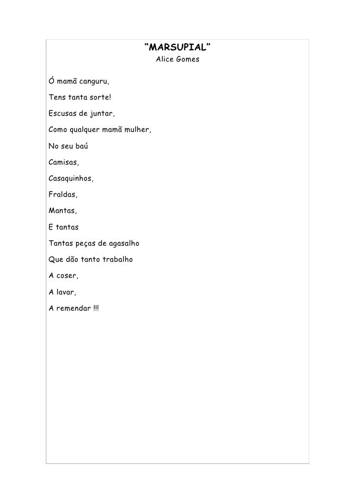 13. 13. “MARSUPIAL” Alice Gomes Ó mamã canguru, Tens tanta sorte! Escusas de juntar, Como qualquer mamã mulher, No seu baú Camisas, Casaquinhos, Fraldas, Mantas, E tantas Tantas peças de agasalho Que dão tanto trabalho A coser, A lavar, A remendar !!!
