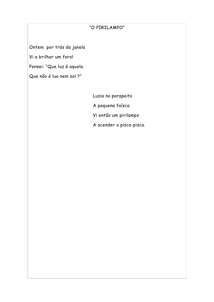 14. 14. “O PIRILAMPO” Ontem por trás da janela Vi a brilhar um farol Pensei: “Que luz é aquela Que não é lua nem sol ?” Luzia no parapeito A pequena faísca Vi então um pirilampo A acender o pisca-pisca.