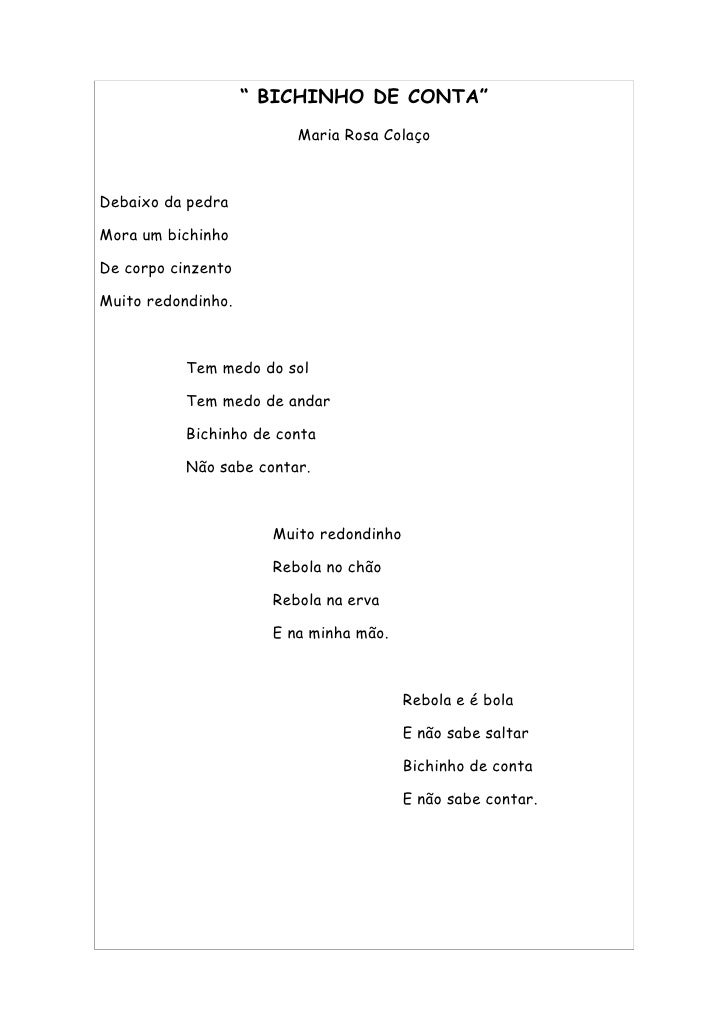 17. 17. “ BICHINHO DE CONTA” Maria Rosa Colaço Debaixo da pedra Mora um bichinho De corpo cinzento Muito redondinho. Tem medo do sol Tem medo de andar Bichinho de conta Não sabe contar. Muito redondinho Rebola no chão Rebola na erva E na minha mão. Rebola e é bola E não sabe saltar Bichinho de conta E não sabe contar.