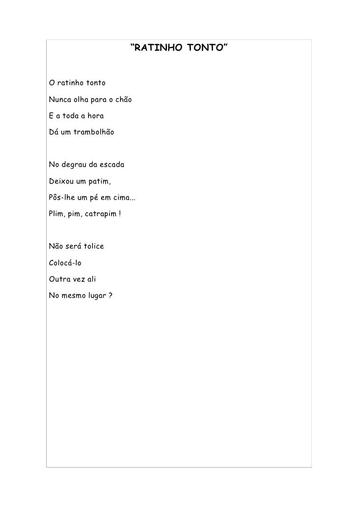 19. 19. “RATINHO TONTO” O ratinho tonto Nunca olha para o chão E a toda a hora Dá um trambolhão No degrau da escada Deixou um patim, Pôs-lhe um pé em cima... Plim, pim, catrapim ! Não será tolice Colocá-lo Outra vez ali No mesmo lugar ?
