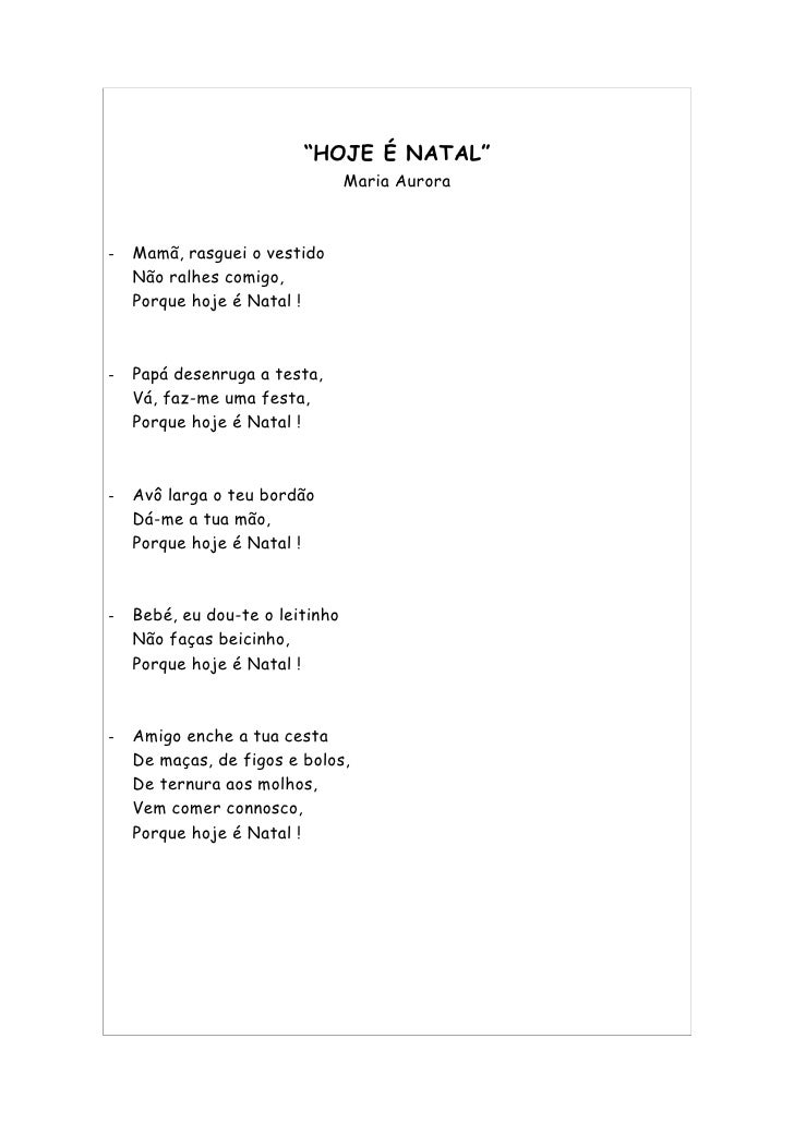 2. 2. “HOJE É NATAL” Maria Aurora - Mamã, rasguei o vestido Não ralhes comigo, Porque hoje é Natal ! - Papá desenruga a testa, Vá, faz-me uma festa, Porque hoje é Natal ! - Avô larga o teu bordão Dá-me a tua mão, Porque hoje é Natal ! - Bebé, eu dou-te o leitinho Não faças beicinho, Porque hoje é Natal ! - Amigo enche a tua cesta De maças, de figos e bolos, De ternura aos molhos, Vem comer connosco, Porque hoje é Natal !
