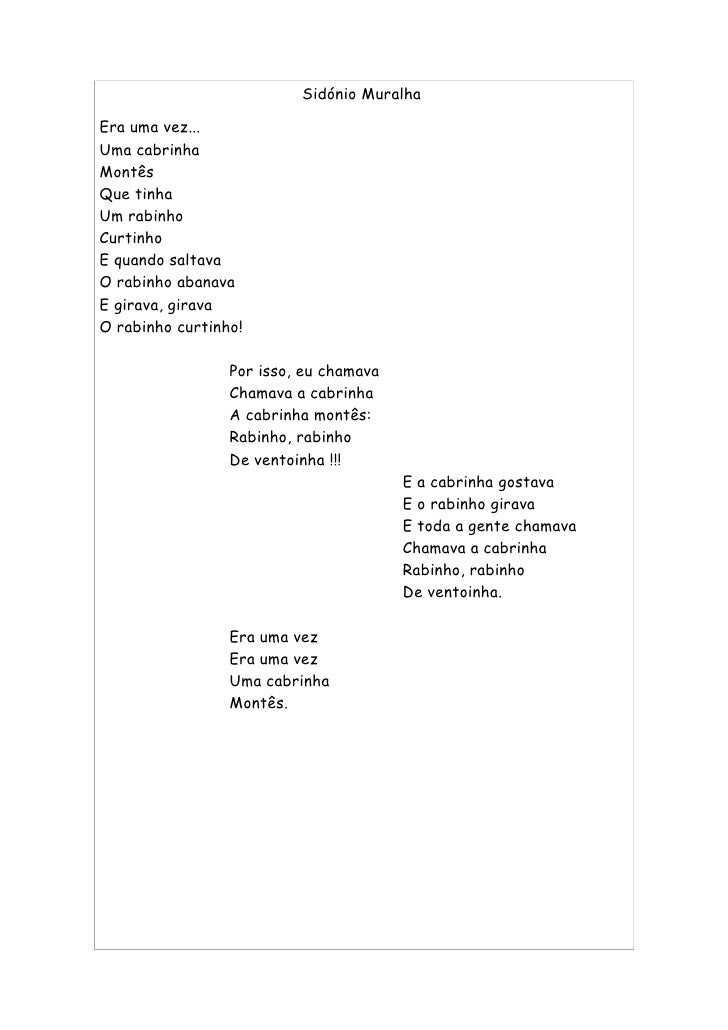 22. 22. Sidónio Muralha Era uma vez... Uma cabrinha Montês Que tinha Um rabinho Curtinho E quando saltava O rabinho abanava E girava, girava O rabinho curtinho! Por isso, eu chamava Chamava a cabrinha A cabrinha montês: Rabinho, rabinho De ventoinha !!! E a cabrinha gostava E o rabinho girava E toda a gente chamava Chamava a cabrinha Rabinho, rabinho De ventoinha. Era uma vez Era uma vez Uma cabrinha Montês.