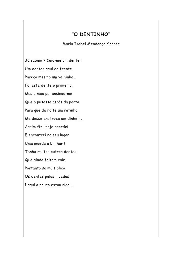 24. 24. “O DENTINHO” Maria Isabel Mendonça Soares Já sabem ? Caiu-me um dente ! Um destes aqui da frente. Pareço mesmo um velhinho... Foi este dente o primeiro. Mas o meu pai ensinou-me Que o pusesse atrás da porta Para que de noite um ratinho Me desse em troca um dinheiro. Assim fiz. Hoje acordei E encontrei no seu lugar Uma moeda a brilhar ! Tenho muitos outros dentes Que ainda faltam cair. Portanto se multiplico Os dentes pelas moedas Daqui a pouco estou rico !!!