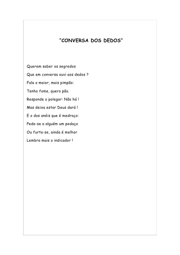 27. 27. “CONVERSA DOS DEDOS” Querem saber os segredos Que em conversa ouvi aos dedos ? Fala o maior, mais pimpão: Tenho fome, quero pão. Responde o polegar: Não há ! Mas deixa estar Deus dará ! E o dos anéis que é medraço: Pede-se a alguém um pedaço Ou furta-se, ainda é melhor Lembra mais o indicador !