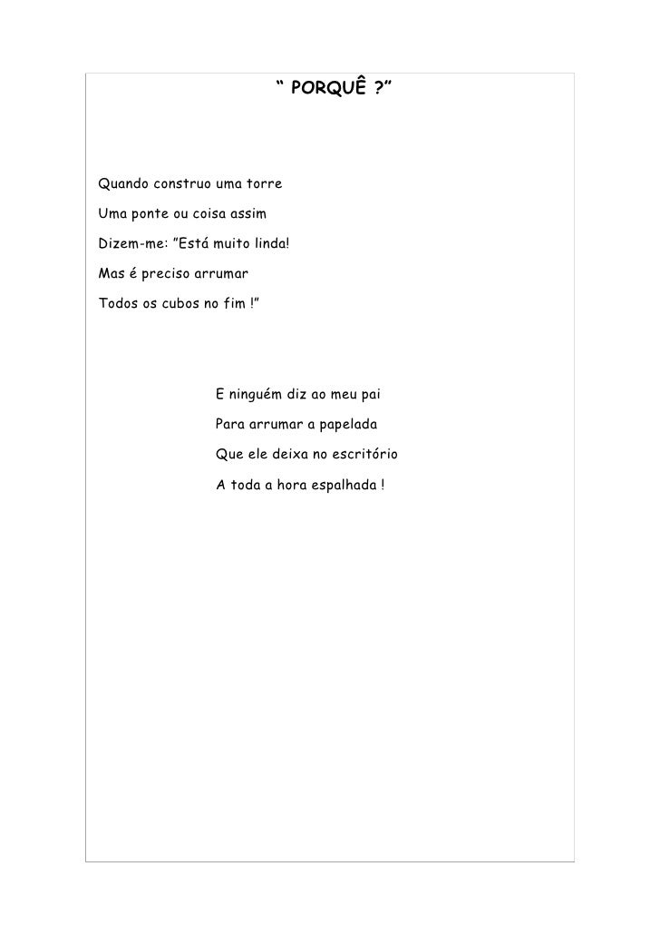 28. 28. “ PORQUÊ ?” Quando construo uma torre Uma ponte ou coisa assim Dizem-me: ”Está muito linda! Mas é preciso arrumar Todos os cubos no fim !” E ninguém diz ao meu pai Para arrumar a papelada Que ele deixa no escritório A toda a hora espalhada !