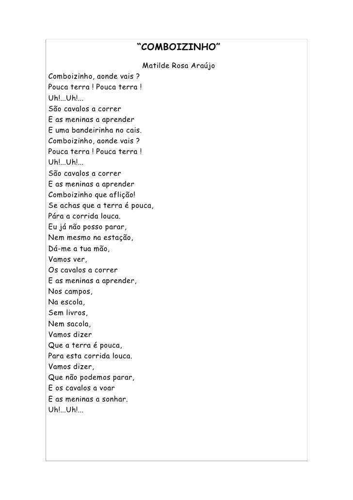31. 31. “COMBOIZINHO” Matilde Rosa Araújo Comboizinho, aonde vais ? Pouca terra ! Pouca terra ! Uh!...Uh!... São cavalos a correr E as meninas a aprender E uma bandeirinha no cais. Comboizinho, aonde vais ? Pouca terra ! Pouca terra ! Uh!...Uh!... São cavalos a correr E as meninas a aprender Comboizinho que aflição! Se achas que a terra é pouca, Pára a corrida louca. Eu já não posso parar, Nem mesmo na estação, Dá-me a tua mão, Vamos ver, Os cavalos a correr E as meninas a aprender, Nos campos, Na escola, Sem livros, Nem sacola, Vamos dizer Que a terra é pouca, Para esta corrida louca. Vamos dizer, Que não podemos parar, E os cavalos a voar E as meninas a sonhar. Uh!...Uh!...