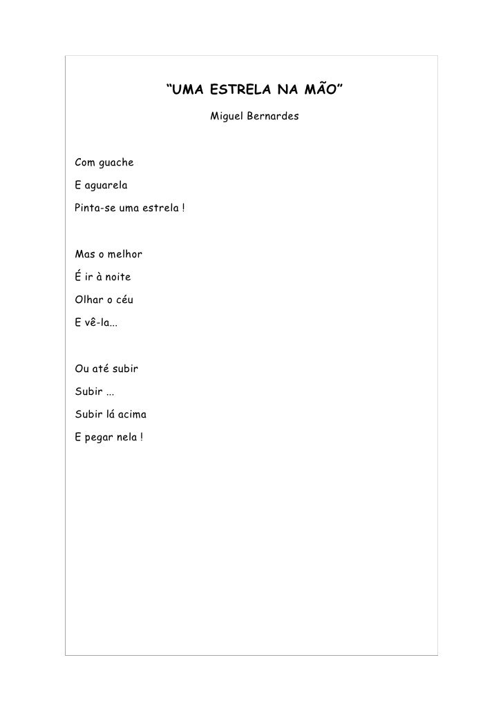 36. 36. “UMA ESTRELA NA MÃO” Miguel Bernardes Com guache E aguarela Pinta-se uma estrela ! Mas o melhor É ir à noite Olhar o céu E vê-la... Ou até subir Subir ... Subir lá acima E pegar nela !