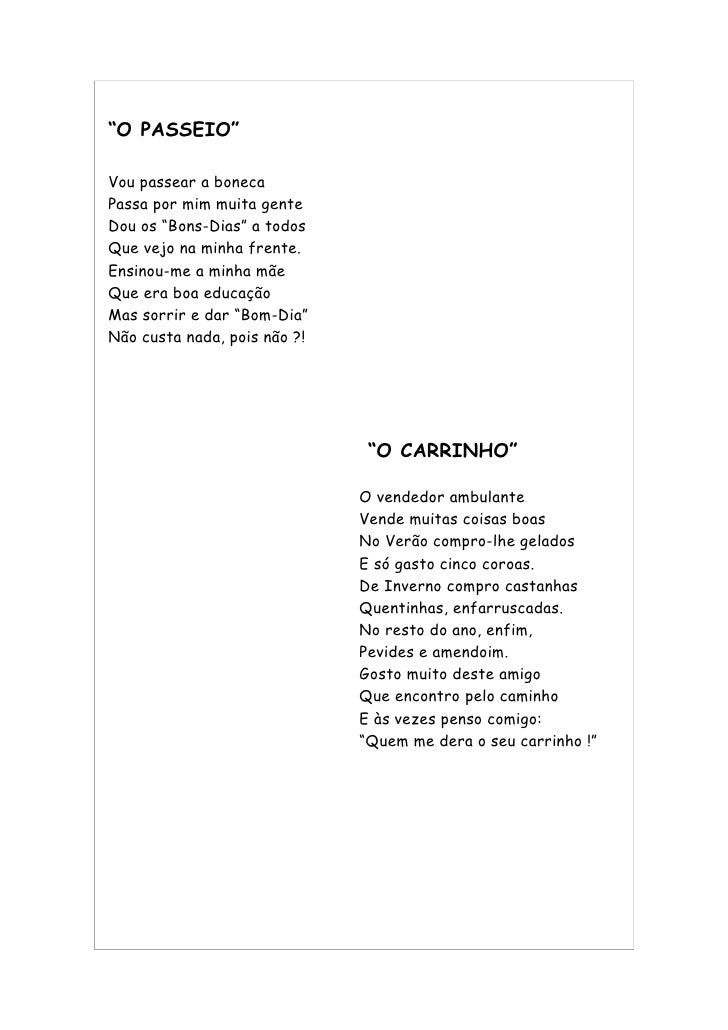 38. 38. “O PASSEIO” Vou passear a boneca Passa por mim muita gente Dou os “Bons-Dias” a todos Que vejo na minha frente. Ensinou-me a minha mãe Que era boa educação Mas sorrir e dar “Bom-Dia” Não custa nada, pois não ?! “O CARRINHO” O vendedor ambulante Vende muitas coisas boas No Verão compro-lhe gelados E só gasto cinco coroas. De Inverno compro castanhas Quentinhas, enfarruscadas. No resto do ano, enfim, Pevides e amendoim. Gosto muito deste amigo Que encontro pelo caminho E às vezes penso comigo: “Quem me dera o seu carrinho !”