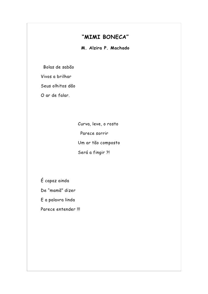 41. 41. “MIMI BONECA” M. Alzira P. Machado Bolas de sabão Vivos a brilhar Seus olhitos dão O ar de falar. Curva, leve, o rosto Parece sorrir Um ar tão composto Será a fingir ?! É capaz ainda De “mamã” dizer E a palavra linda Parece entender !!!