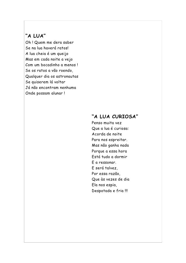 43. 43. “A LUA” Oh ! Quem me dera saber Se na lua haverá ratos! A lua cheia é um queijo Mas em cada noite a vejo Com um bocadinho a menos ! Se os ratos a vão roendo, Qualquer dia os astronautas Se quiserem lá voltar Já não encontram nenhuma Onde possam alunar ! “A LUA CURIOSA” Penso muita vez Que a lua é curiosa: Acorda de noite Para nos espreitar. Mas não ganha nada Porque a essa hora Está tudo a dormir E a ressonar. E será talvez, Por essa razão, Que às vezes de dia Ela nos espia, Despotada e fria !!!