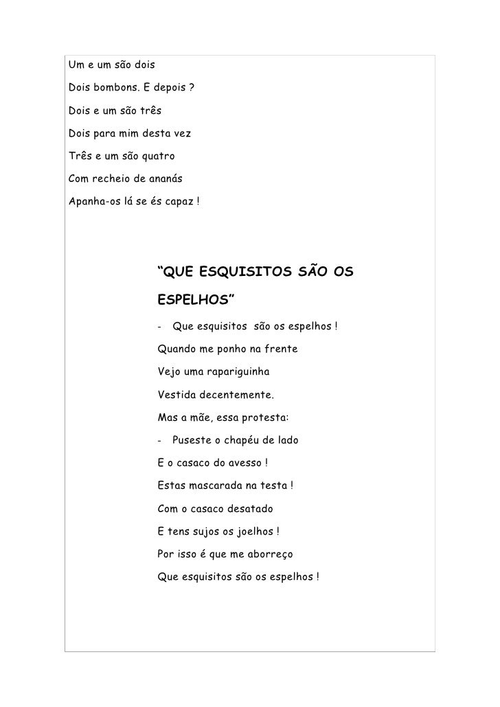 47. 47. Um e um são dois Dois bombons. E depois ? Dois e um são três Dois para mim desta vez Três e um são quatro Com recheio de ananás Apanha-os lá se és capaz ! “QUE ESQUISITOS SÃO OS ESPELHOS” - Que esquisitos são os espelhos ! Quando me ponho na frente Vejo uma rapariguinha Vestida decentemente. Mas a mãe, essa protesta: - Puseste o chapéu de lado E o casaco do avesso ! Estas mascarada na testa ! Com o casaco desatado E tens sujos os joelhos ! Por isso é que me aborreço Que esquisitos são os espelhos !