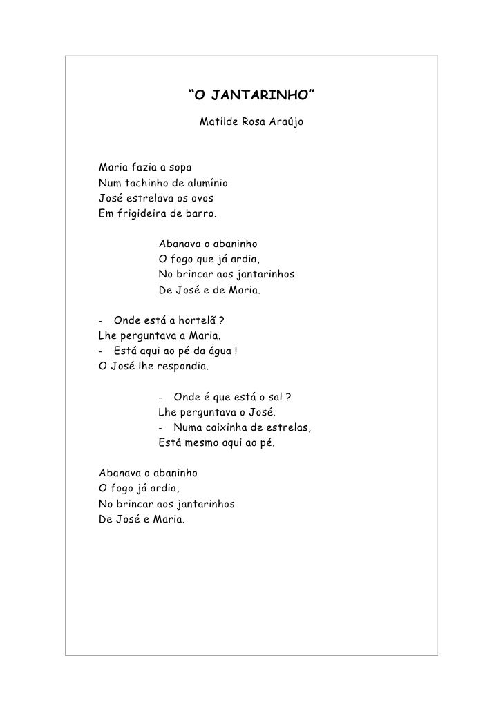 48. 48. “O JANTARINHO” Matilde Rosa Araújo Maria fazia a sopa Num tachinho de alumínio José estrelava os ovos Em frigideira de barro. Abanava o abaninho O fogo que já ardia, No brincar aos jantarinhos De José e de Maria. - Onde está a hortelã ? Lhe perguntava a Maria. - Está aqui ao pé da água ! O José lhe respondia. - Onde é que está o sal ? Lhe perguntava o José. - Numa caixinha de estrelas, Está mesmo aqui ao pé. Abanava o abaninho O fogo já ardia, No brincar aos jantarinhos De José e Maria.