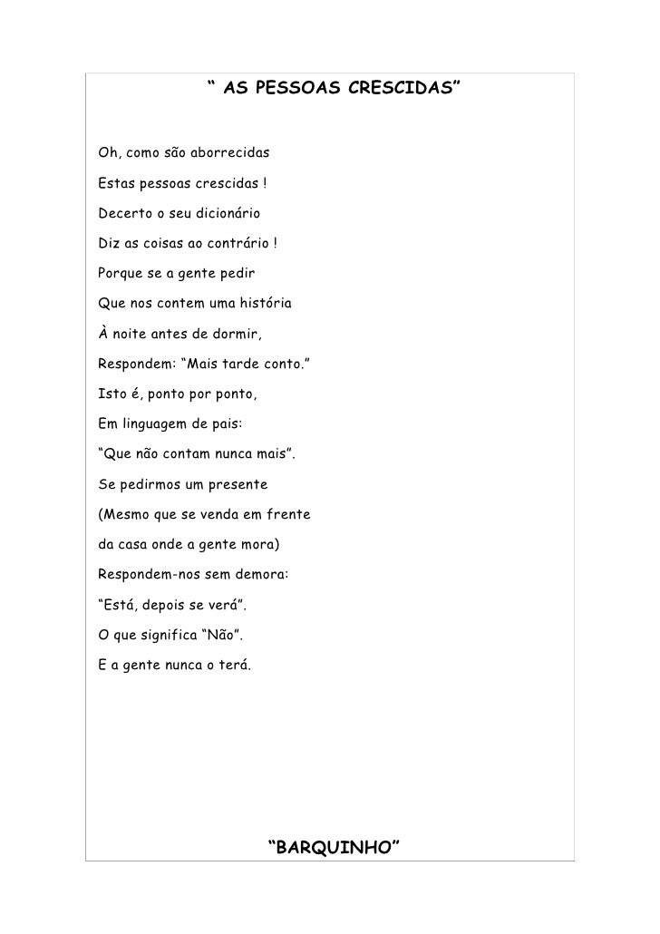 49. 49. “ AS PESSOAS CRESCIDAS” Oh, como são aborrecidas Estas pessoas crescidas ! Decerto o seu dicionário Diz as coisas ao contrário ! Porque se a gente pedir Que nos contem uma história À noite antes de dormir, Respondem: “Mais tarde conto.” Isto é, ponto por ponto, Em linguagem de pais: “Que não contam nunca mais”. Se pedirmos um presente (Mesmo que se venda em frente da casa onde a gente mora) Respondem-nos sem demora: “Está, depois se verá”. O que significa “Não”. E a gente nunca o terá. “BARQUINHO”