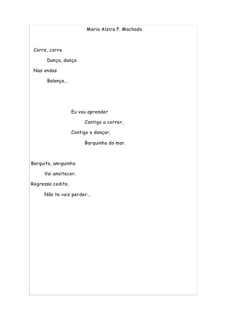 50. 50. Maria Alzira P. Machado Corre, corre Dança, dança Nas ondas Balança... Eu vou aprender Contigo a correr, Contigo a dançar, Barquinho do mar. Barquito, amiguinho Vai anoitecer. Regressa cedito, Não te vais perder...